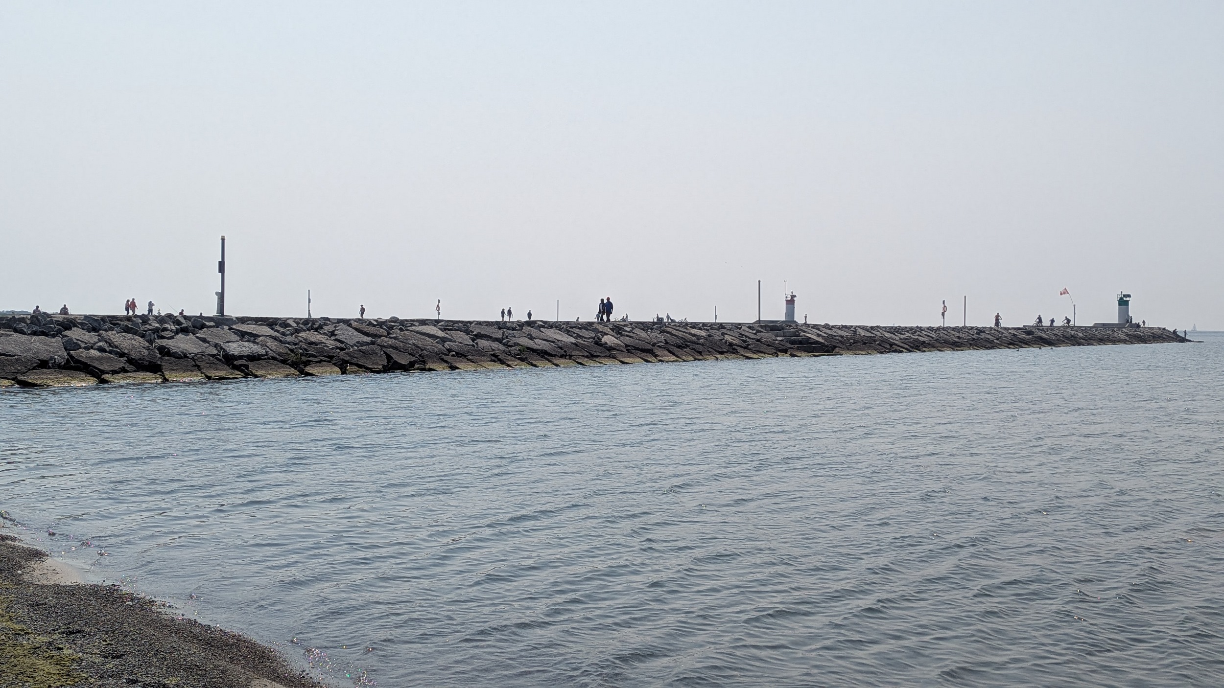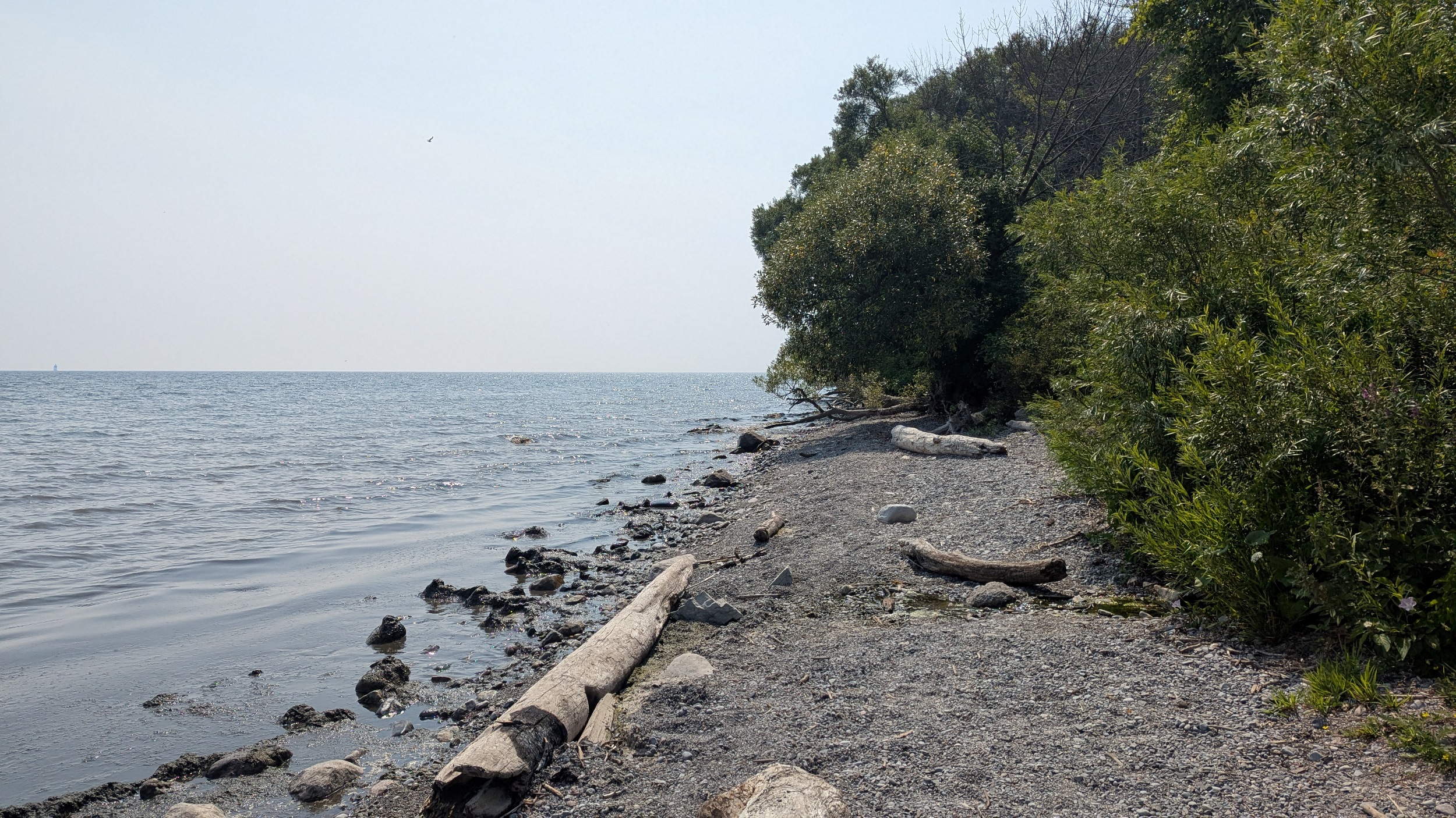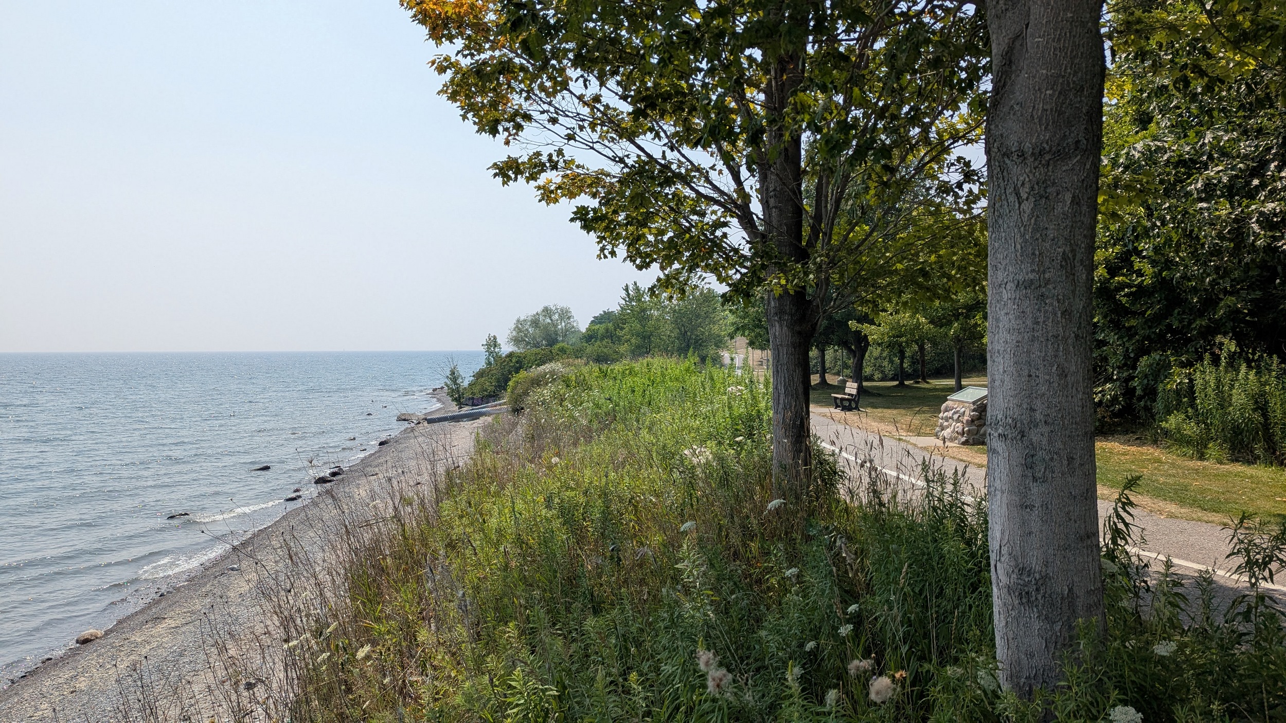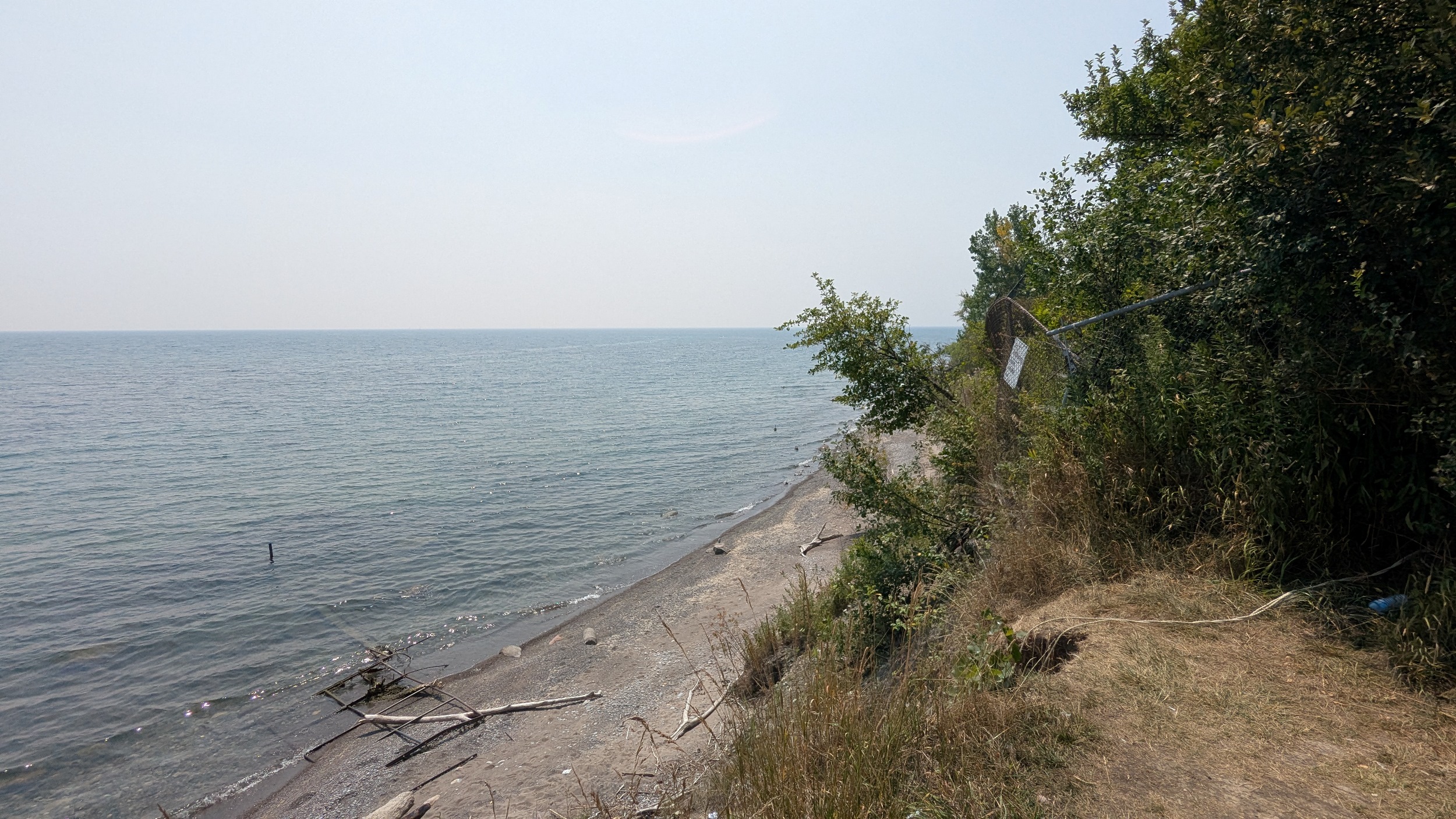 After getting around a couple more properties, you meet the beach along Beachpoint Promenade. This is the southwest corner of Frenchman’s Bay. The view from the west pier confirms that the smoke is still a factor, but I can feel the tussle between the northern inflow and the lake breeze.