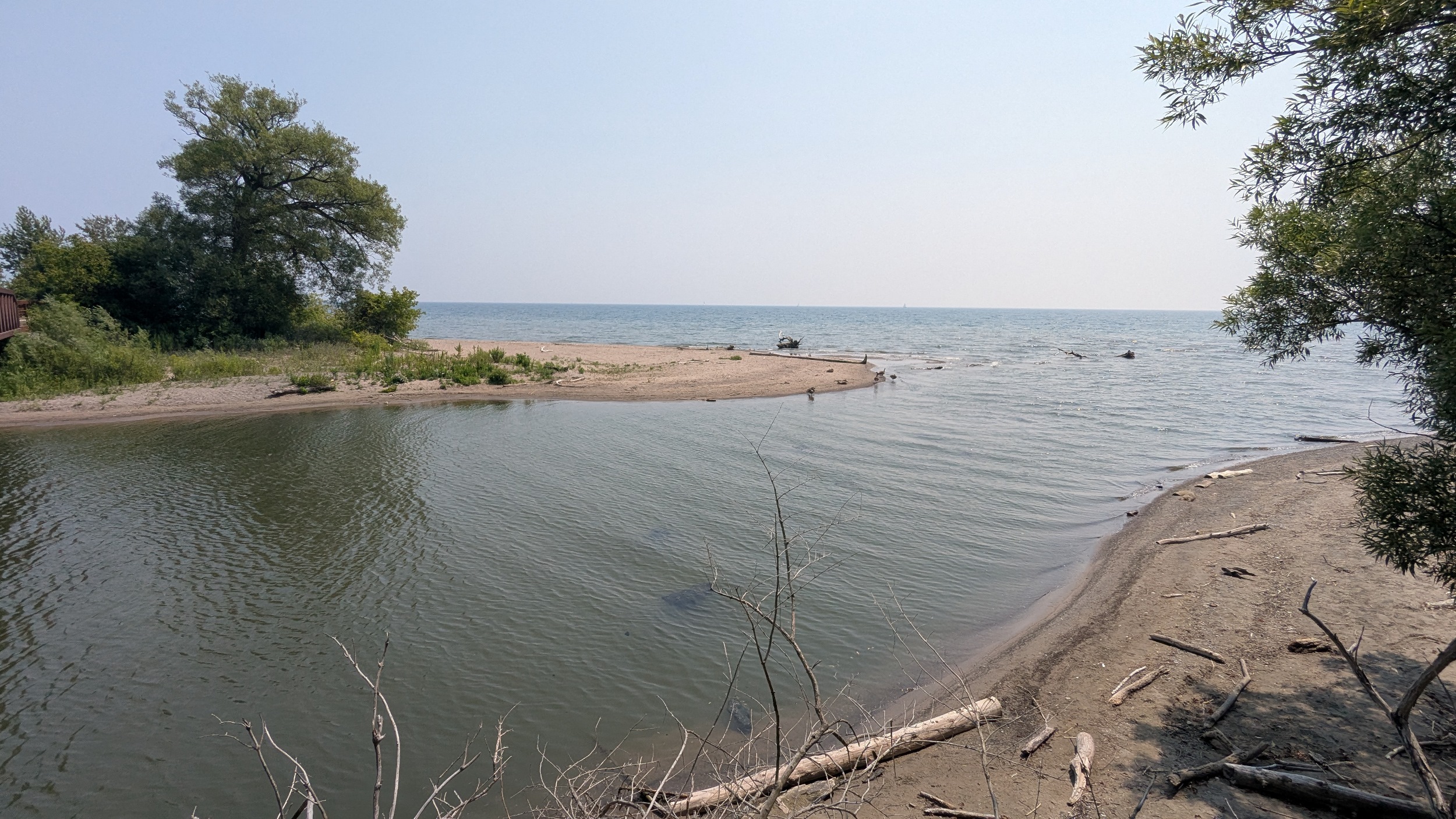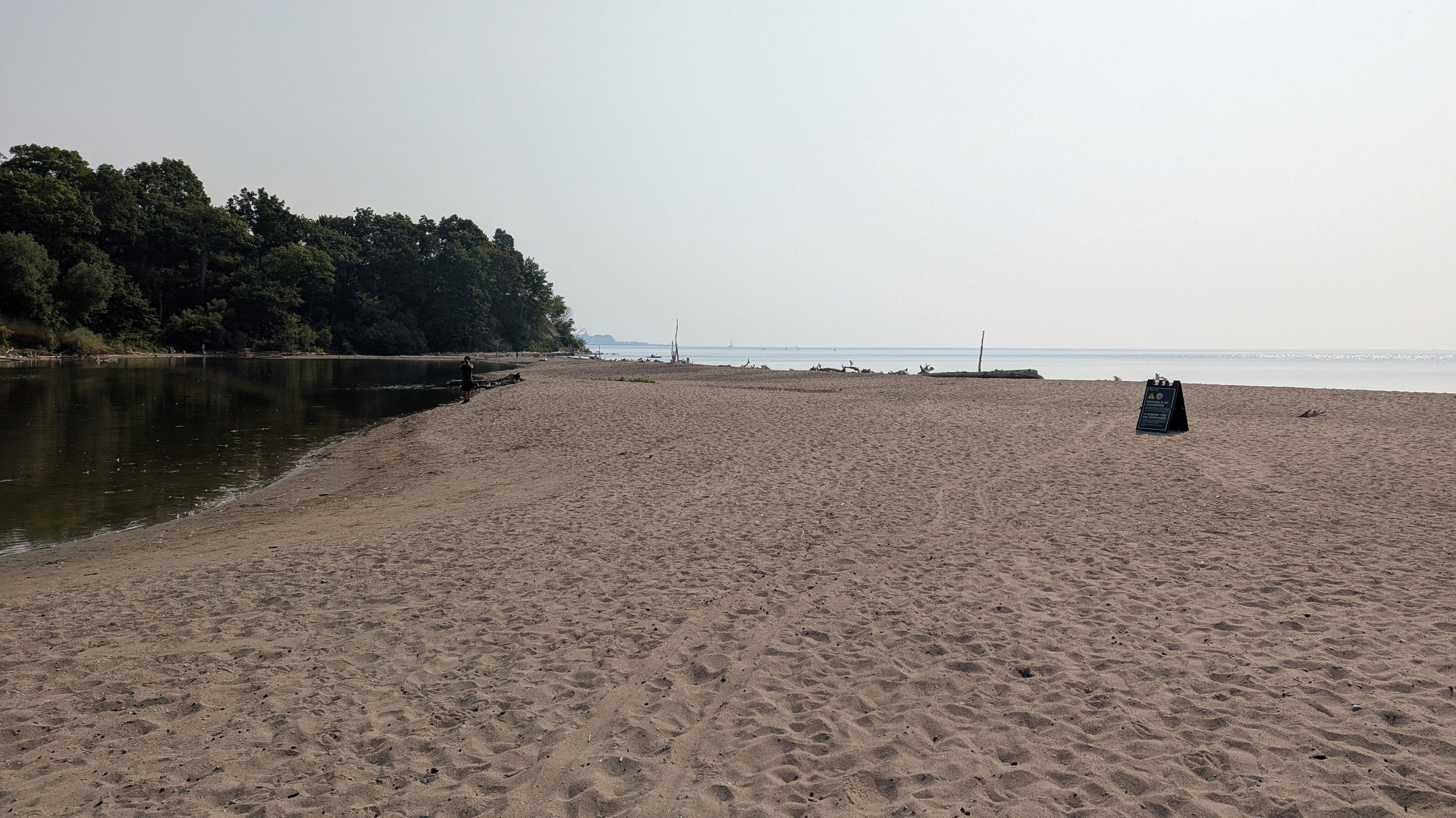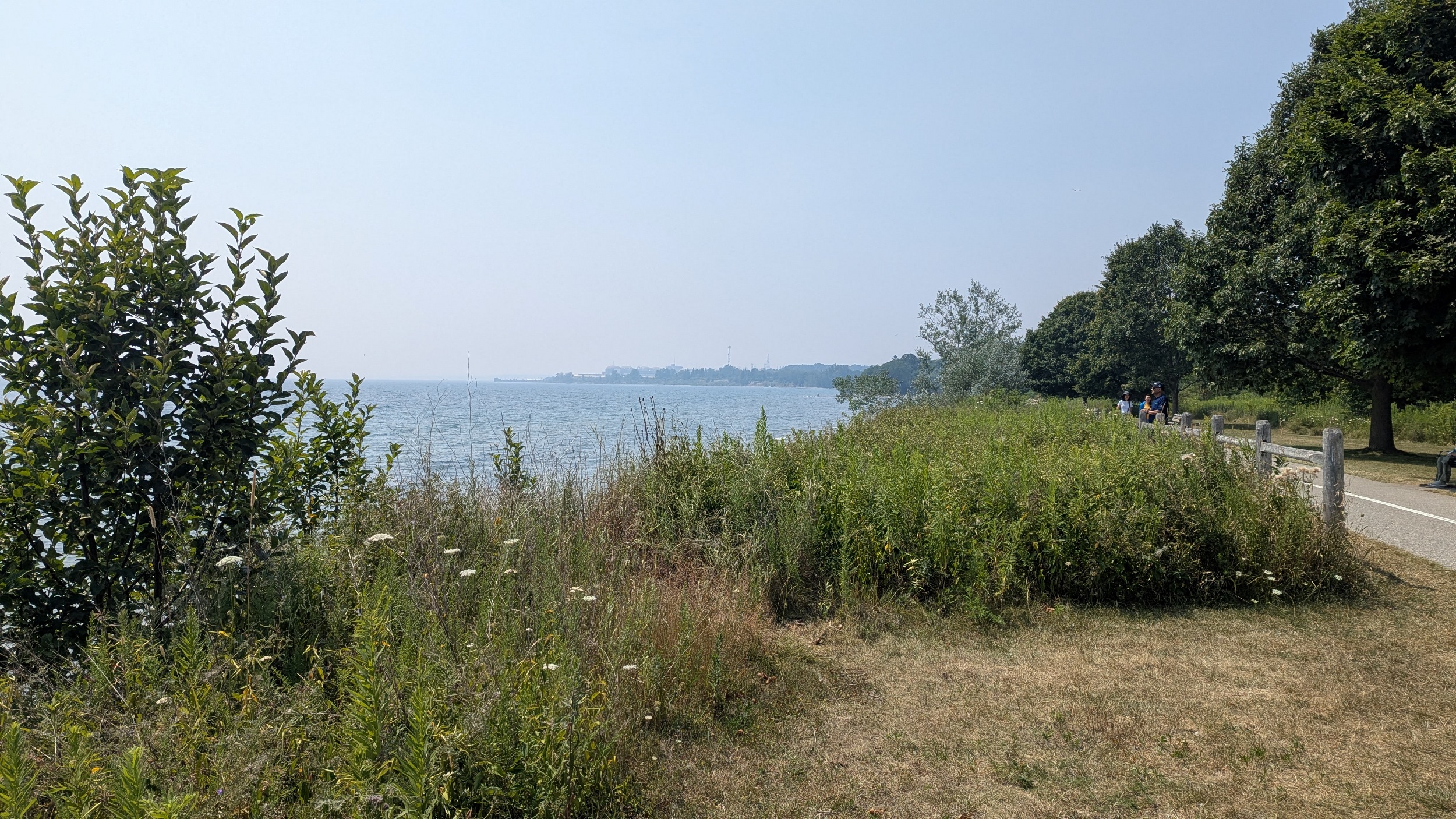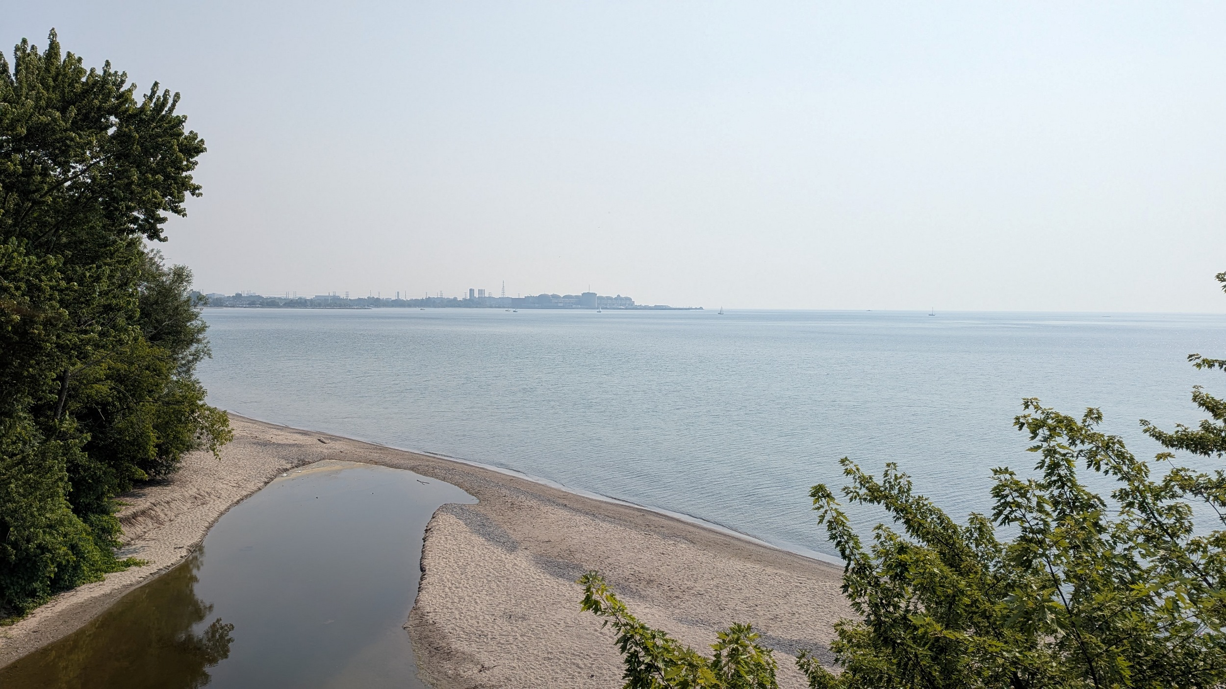 After getting around a couple more properties, you meet the beach along Beachpoint Promenade. This is the southwest corner of Frenchman’s Bay. The view from the west pier confirms that the smoke is still a factor, but I can feel the tussle between the northern inflow and the lake breeze.