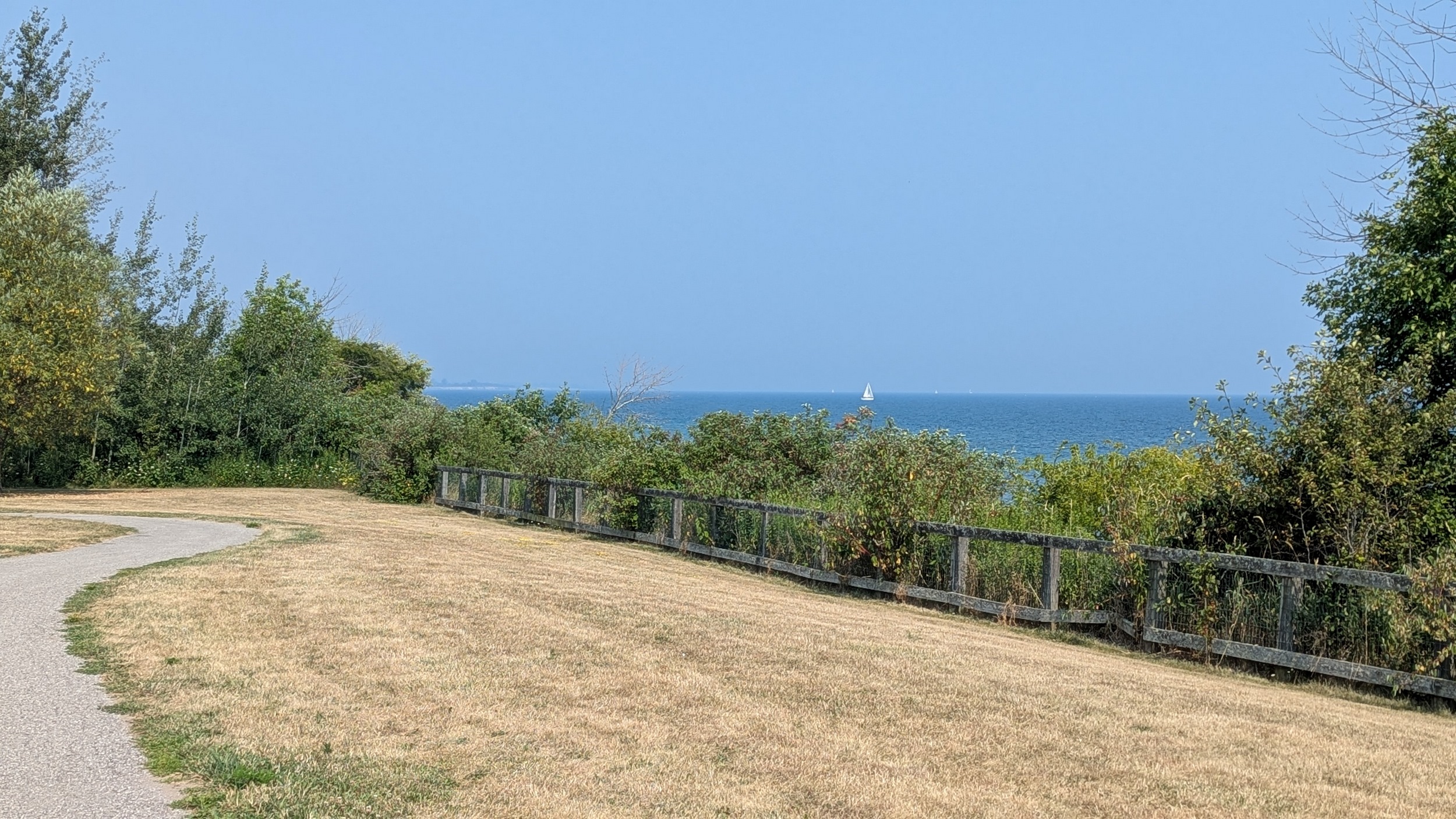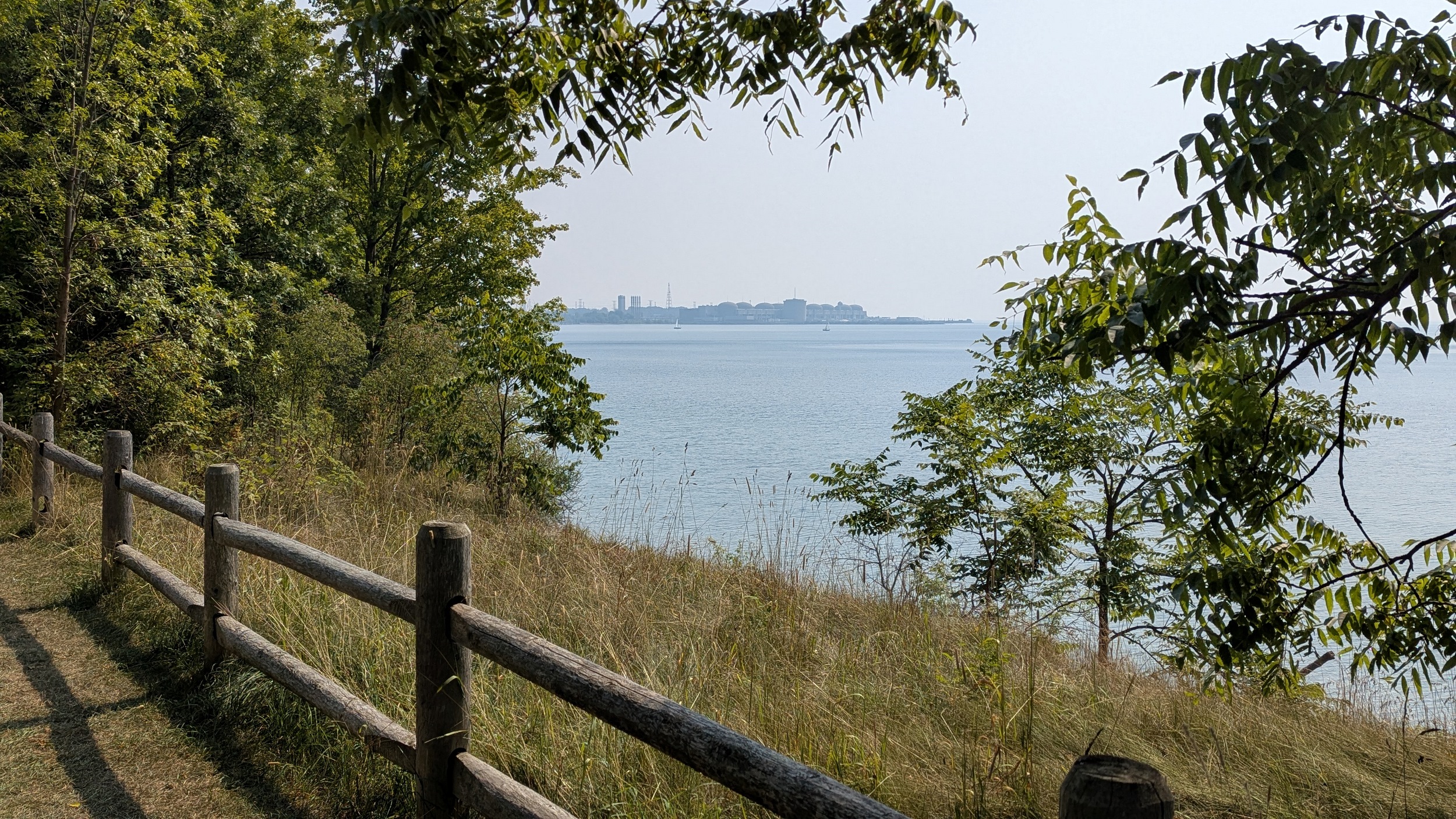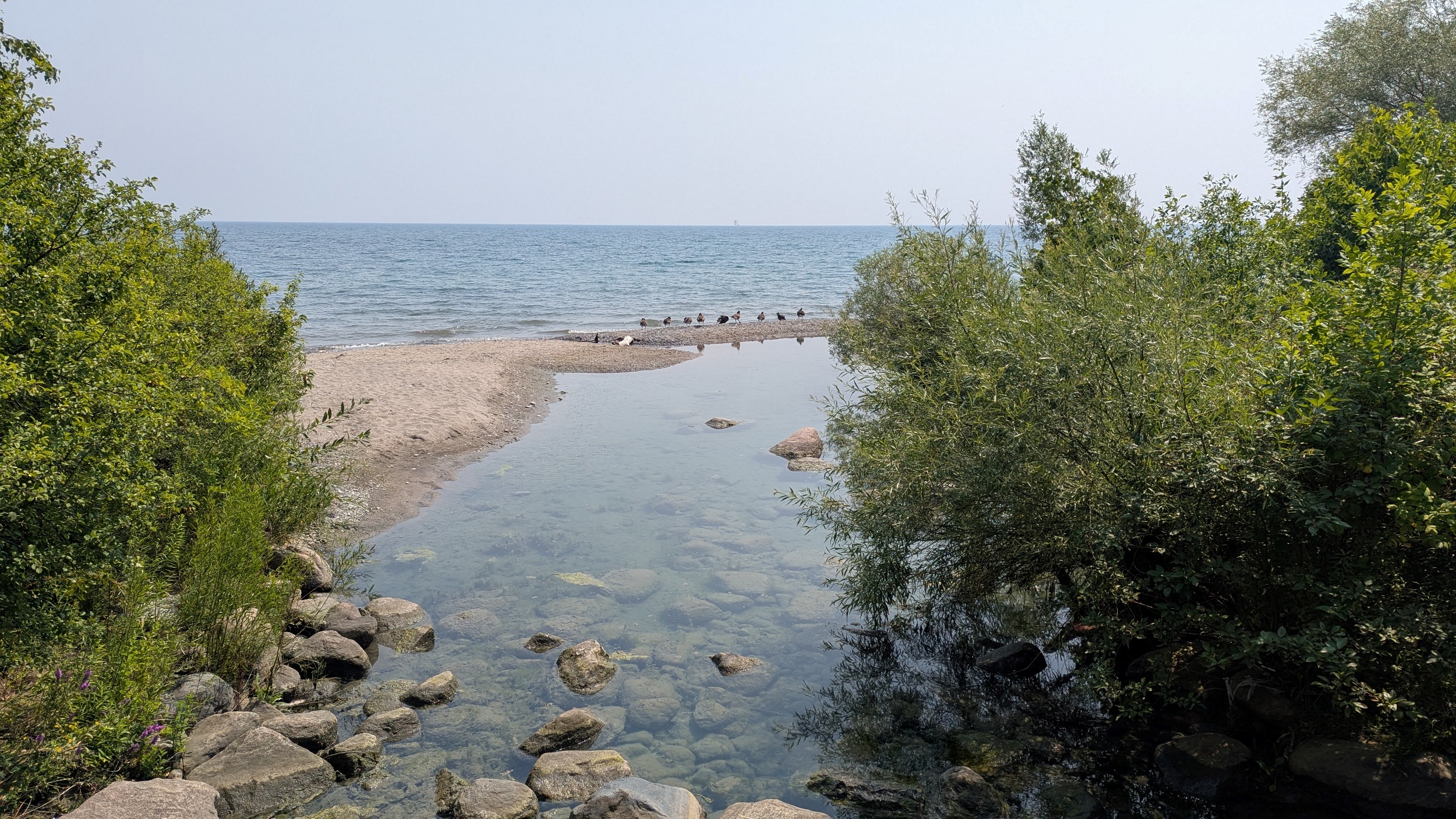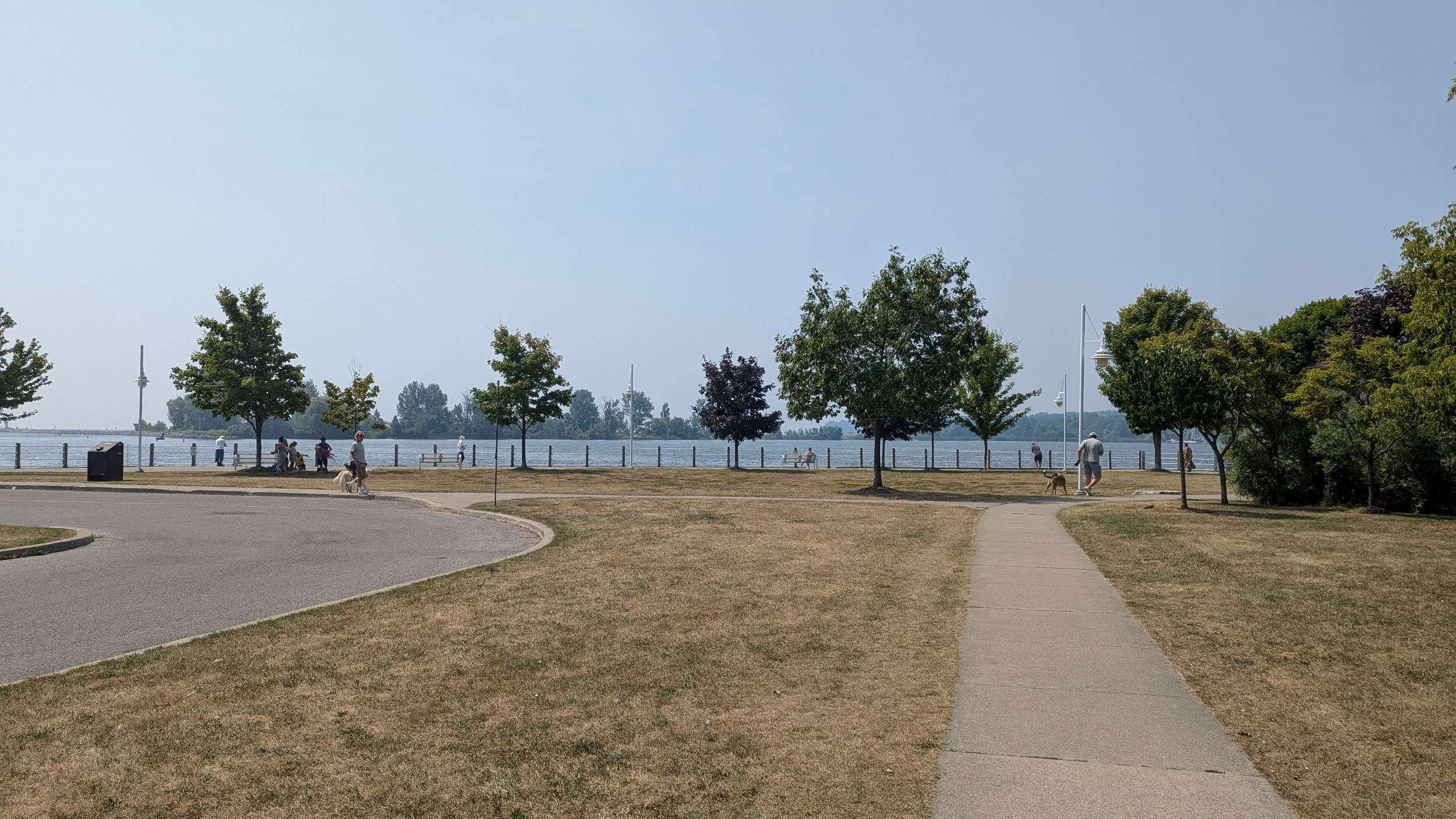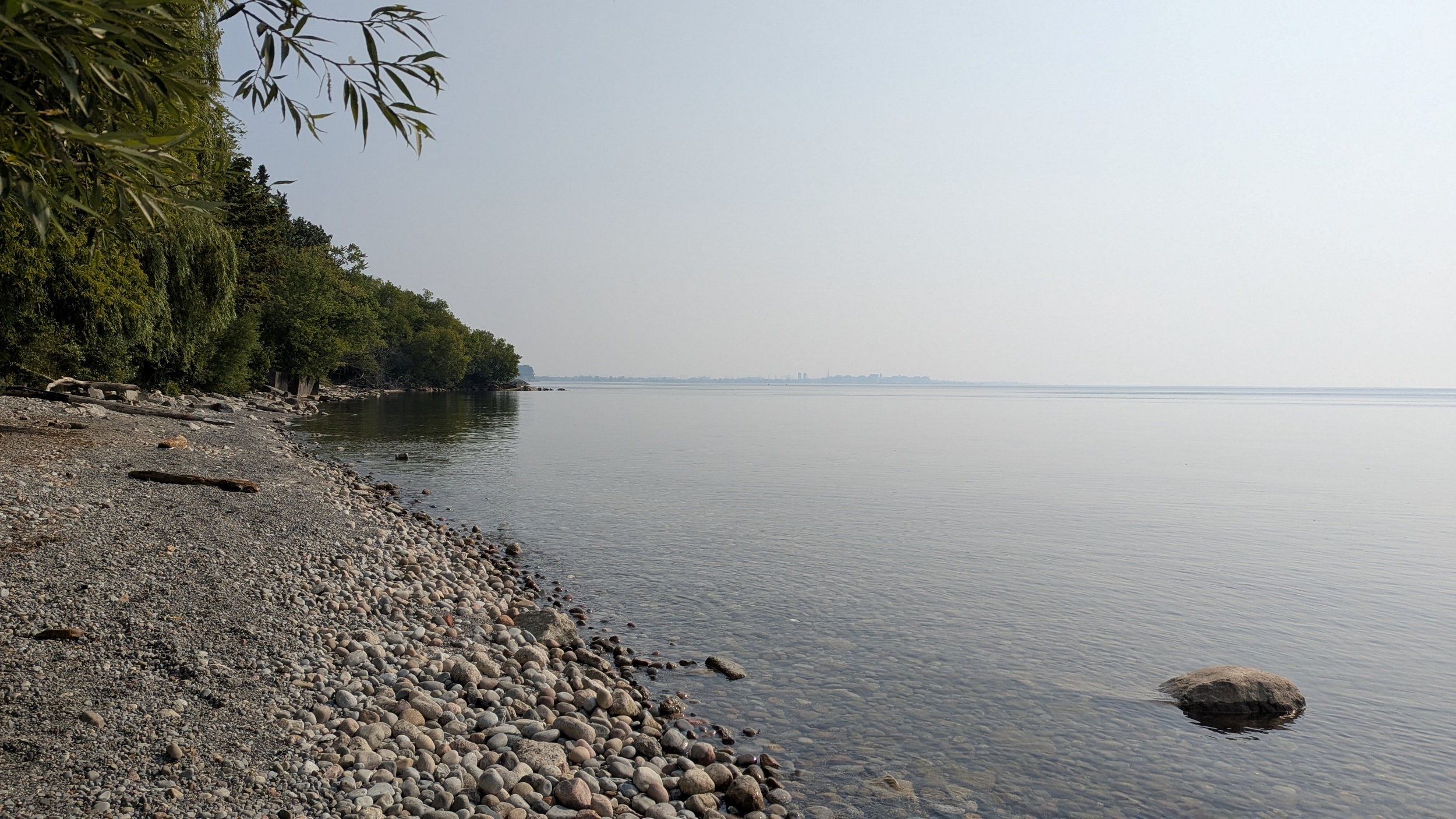 After getting around a couple more properties, you meet the beach along Beachpoint Promenade. This is the southwest corner of Frenchman’s Bay. The view from the west pier confirms that the smoke is still a factor, but I can feel the tussle between the northern inflow and the lake breeze.