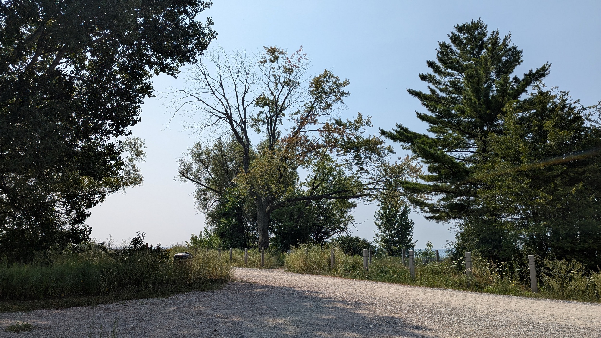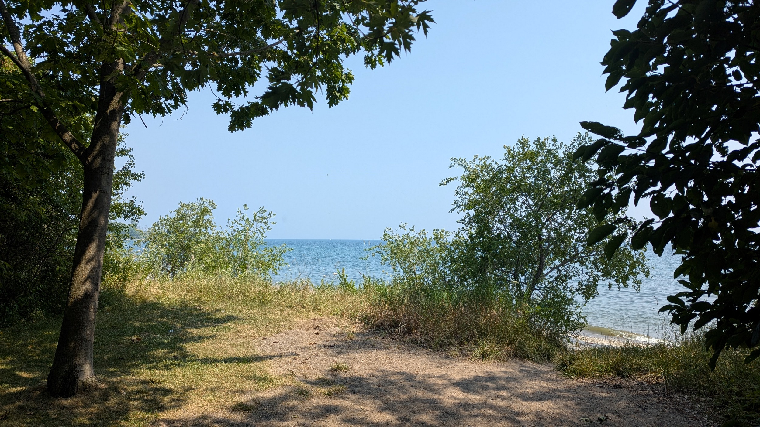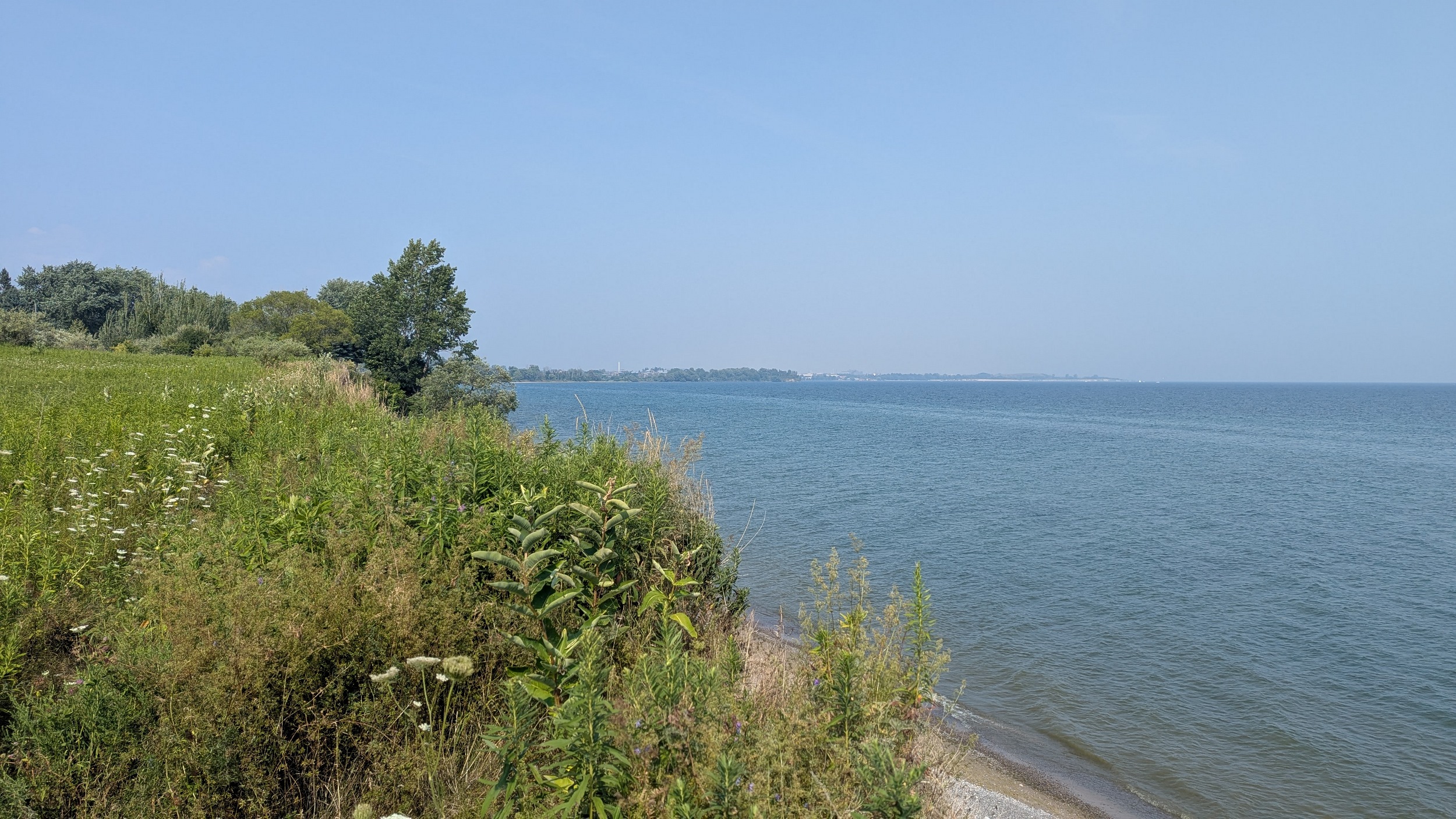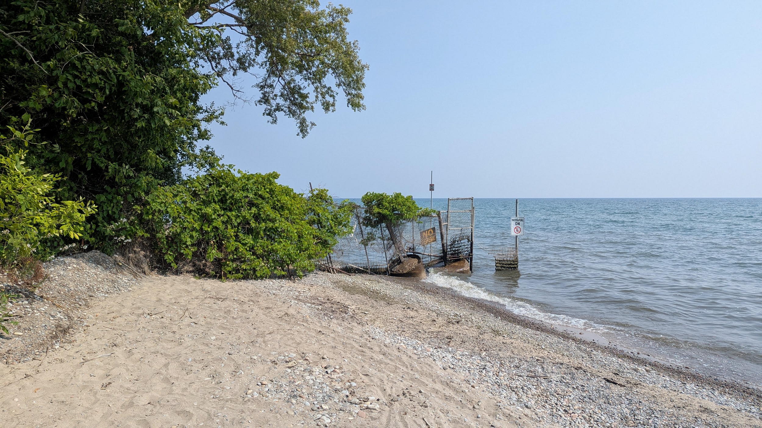 After getting around a couple more properties, you meet the beach along Beachpoint Promenade. This is the southwest corner of Frenchman’s Bay. The view from the west pier confirms that the smoke is still a factor, but I can feel the tussle between the northern inflow and the lake breeze.