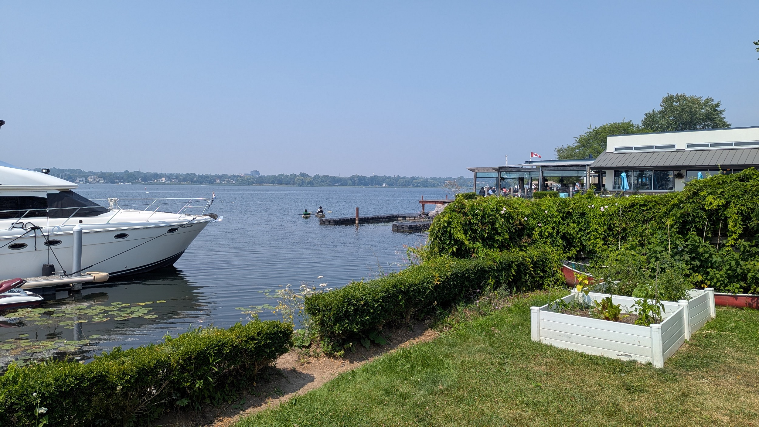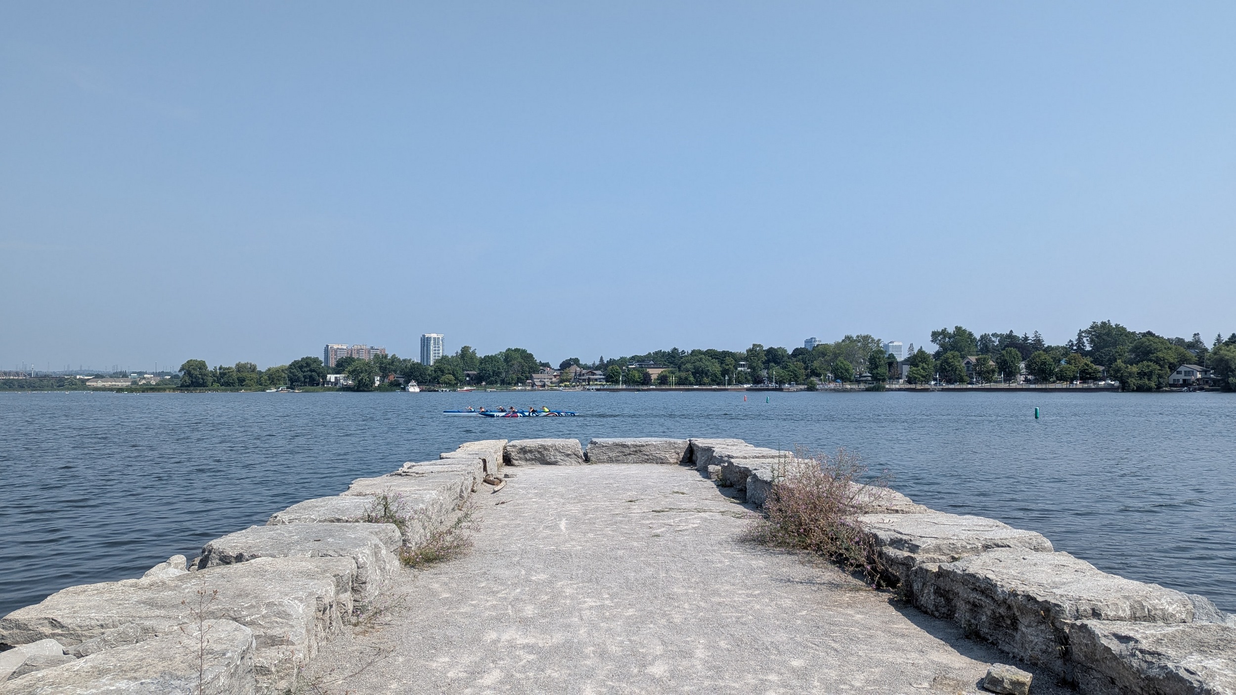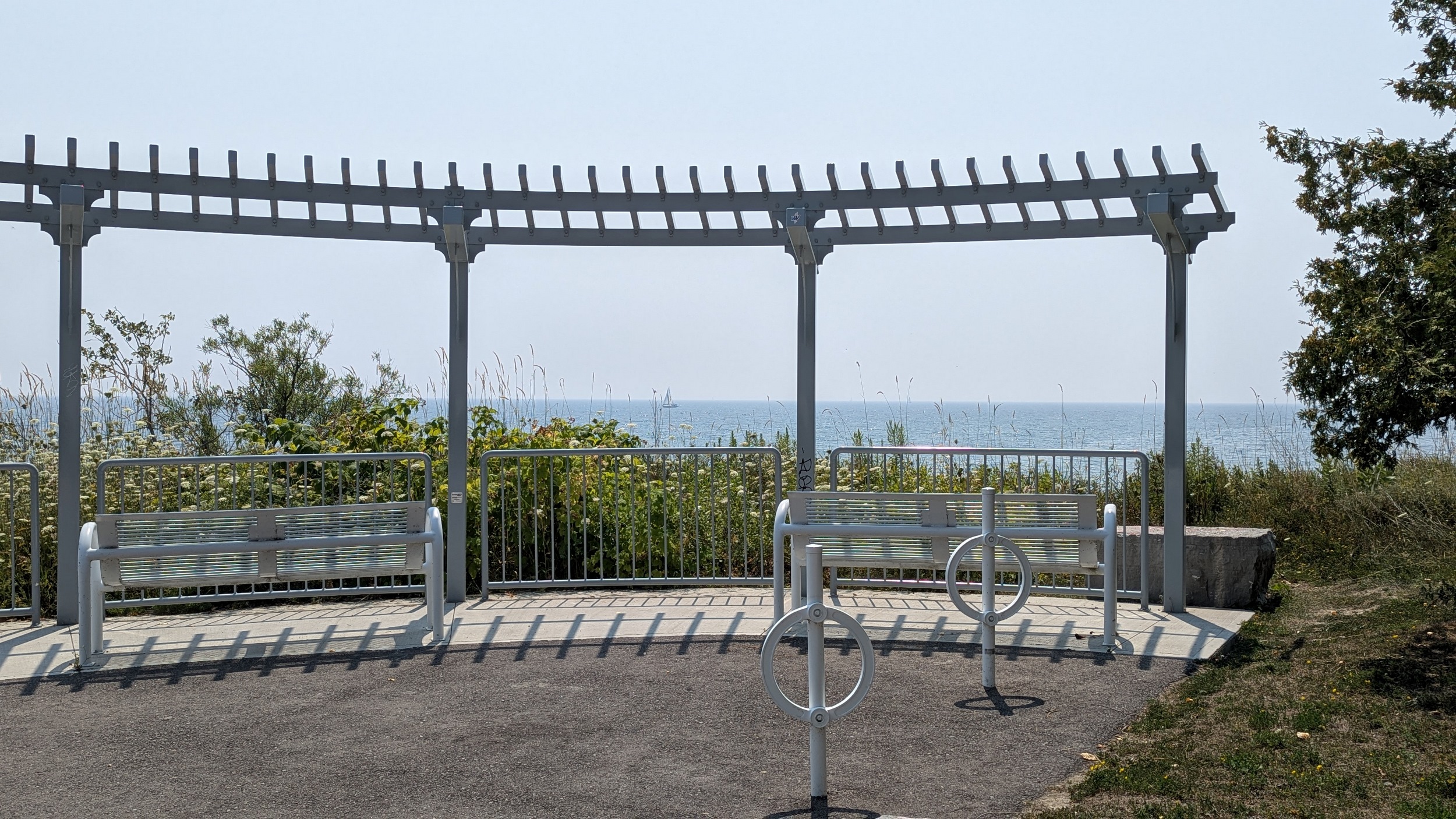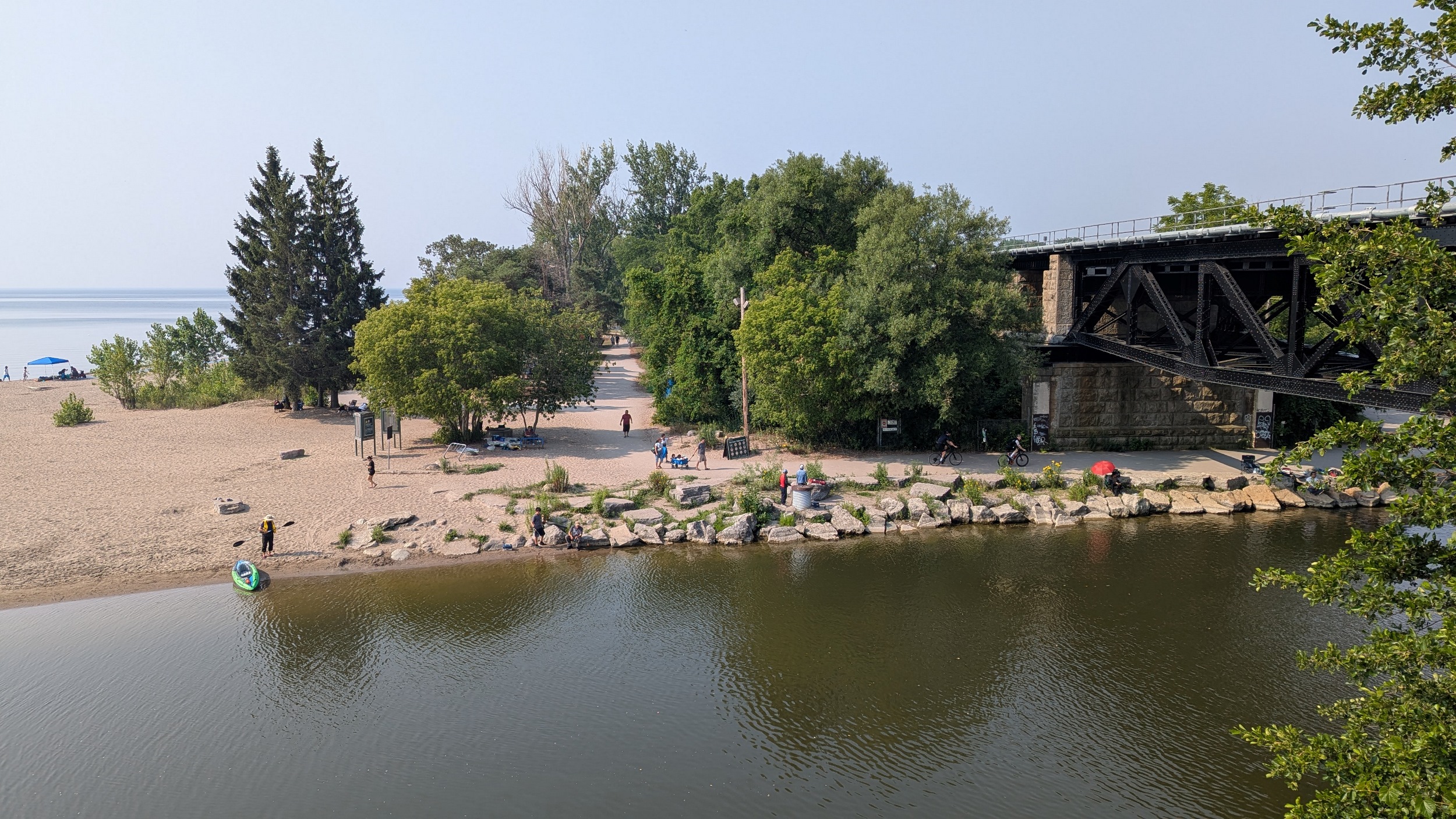 After getting around a couple more properties, you meet the beach along Beachpoint Promenade. This is the southwest corner of Frenchman’s Bay. The view from the west pier confirms that the smoke is still a factor, but I can feel the tussle between the northern inflow and the lake breeze.