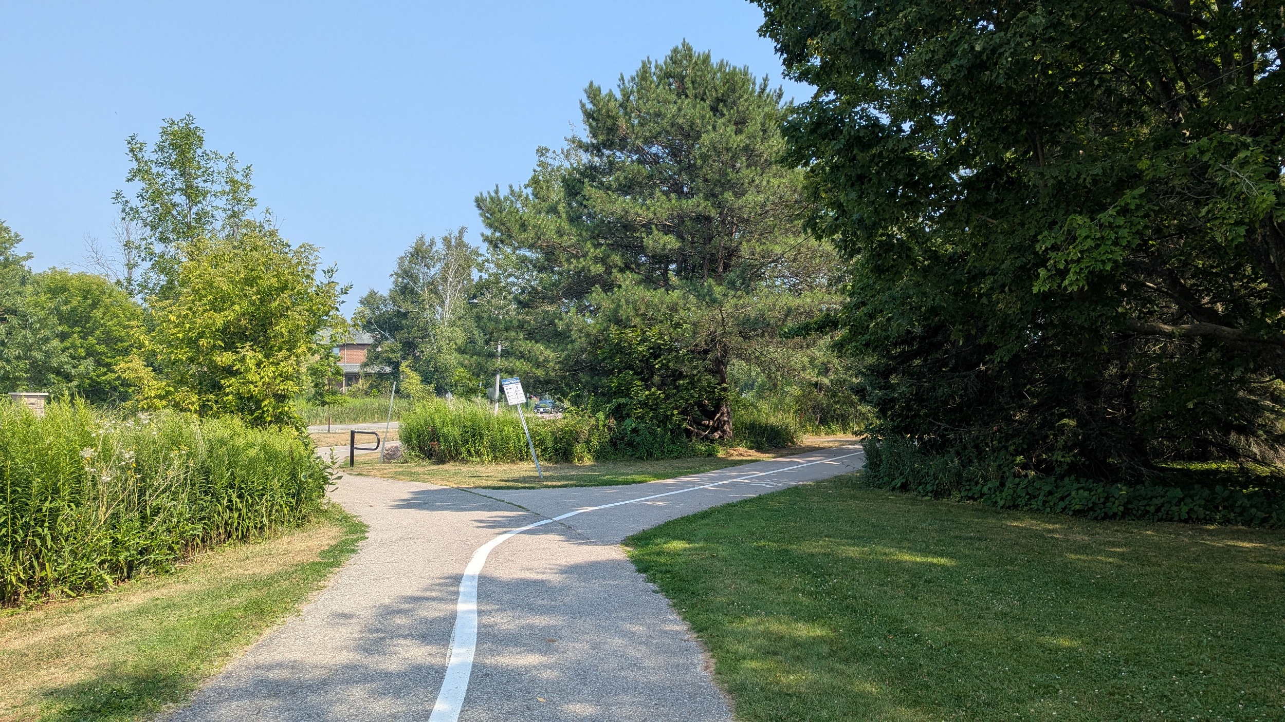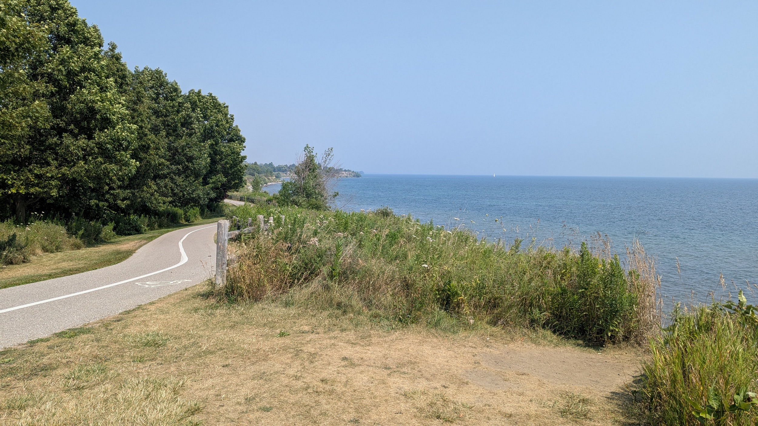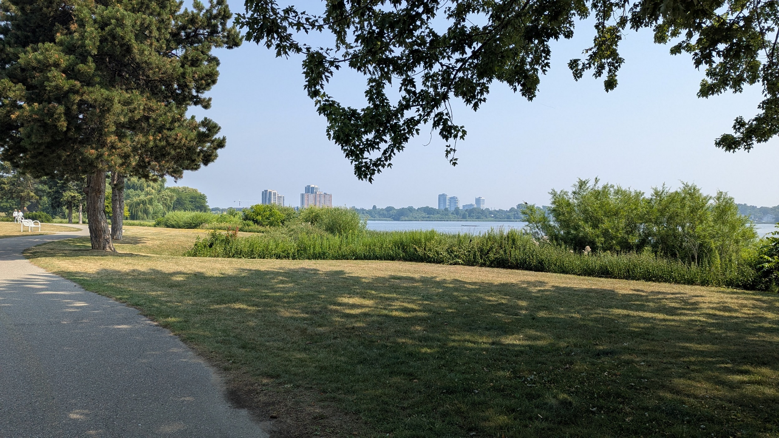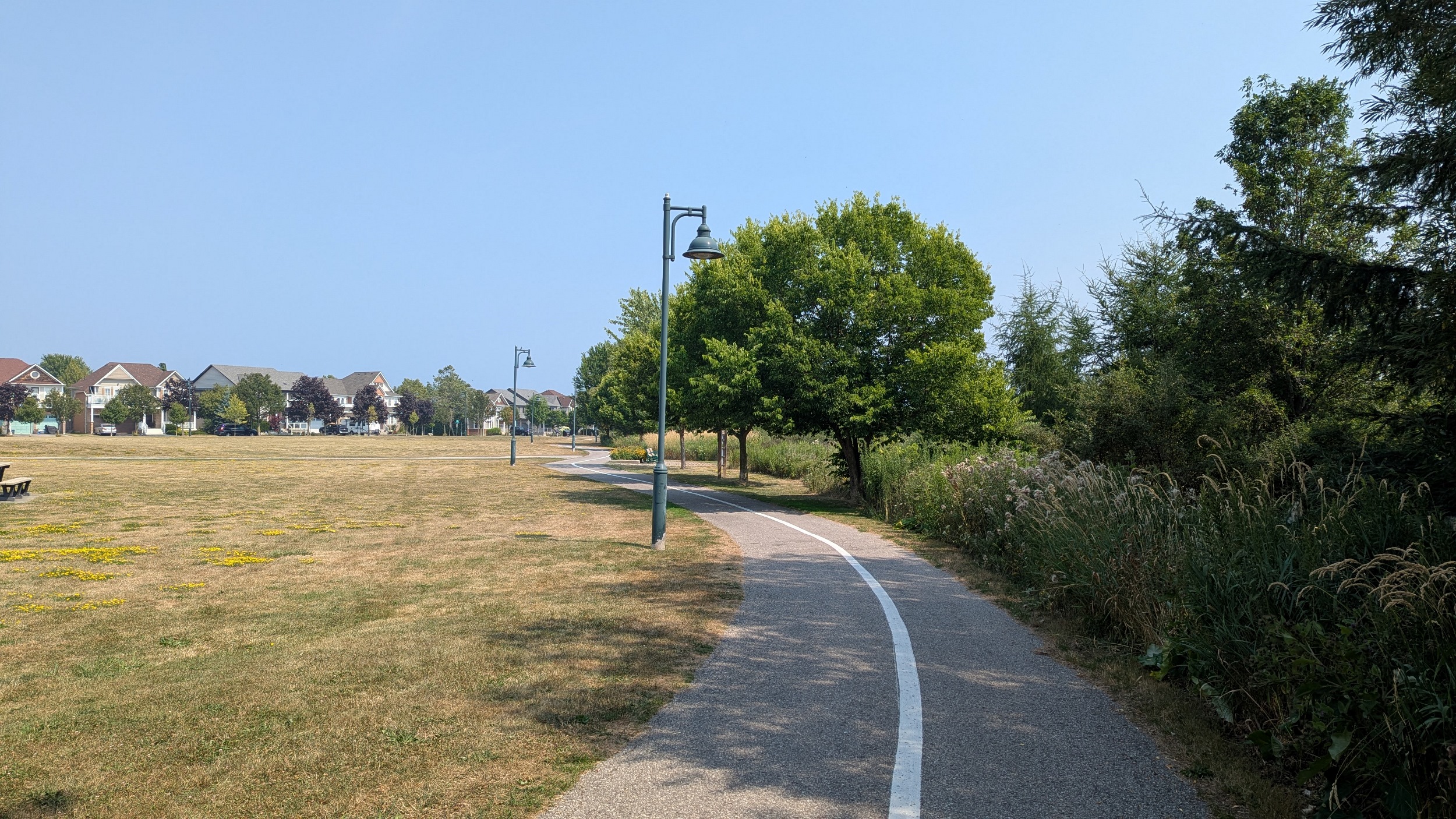 Through Ajax’s Waterfront Park, with a solid trail, benches, lots of trees and plentiful open space. Top marks for a pavilion with cold treats for sale, and free public washrooms and fountains close to the waterfront trail. That said, it’s hot and exposed. It’s fine when the lake breezes are coming over the bluff to cool you, but there’s some stagnant sections that’ll bake you if you aren’t under a tree.