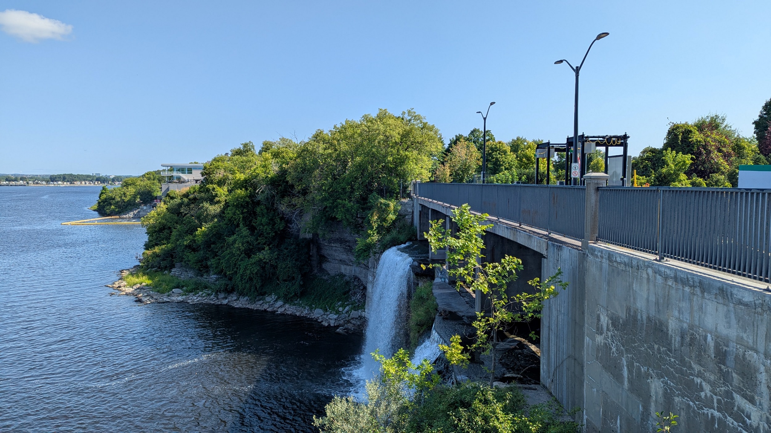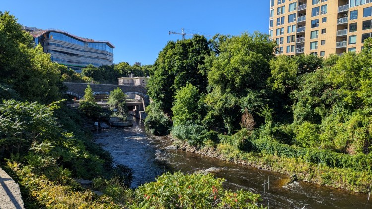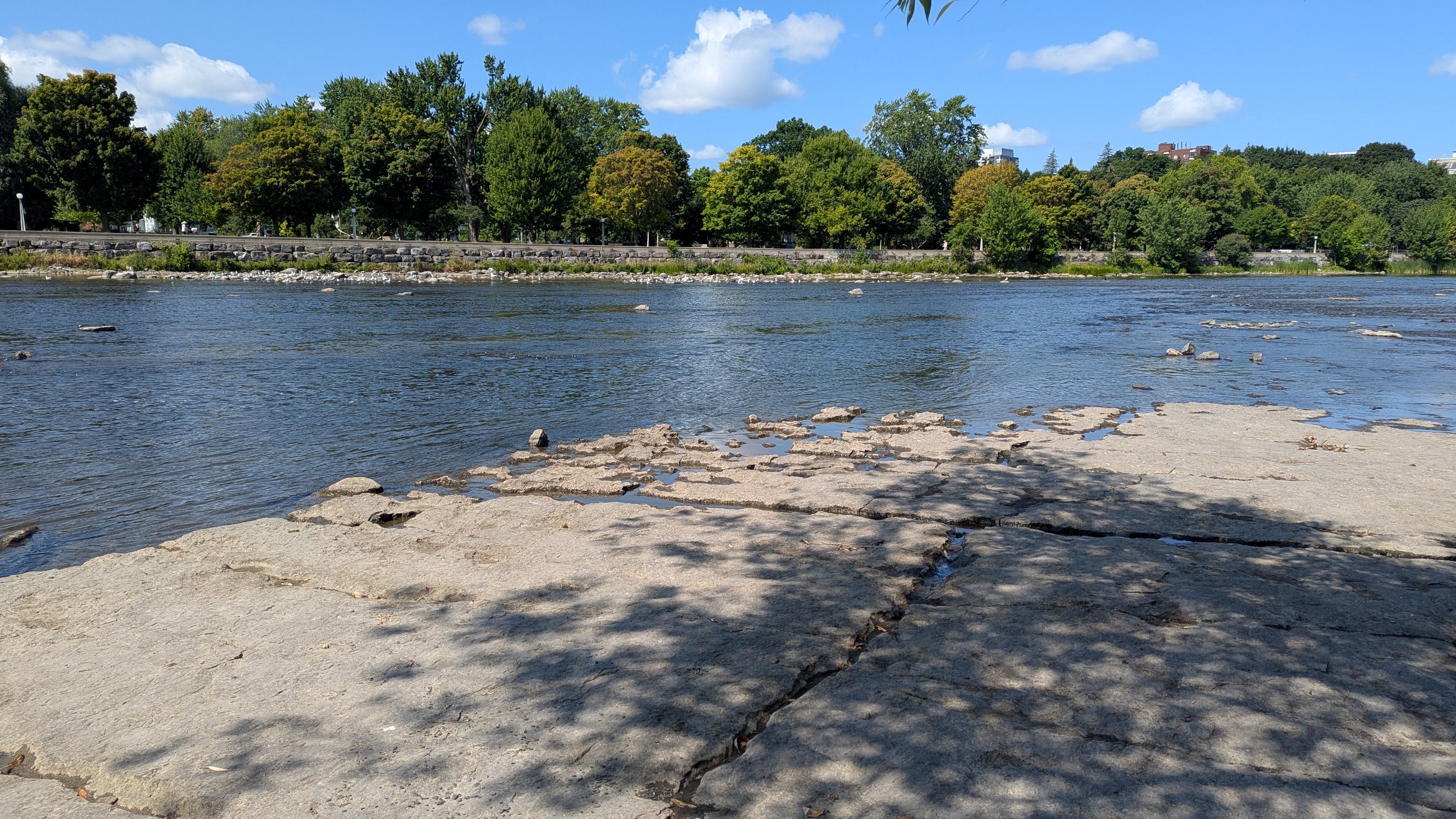 Under the Heron Road Parkway where you’re high up on the cliff bank. Then you come to Hogs Back Falls, where water in the Rideau River is regulated by a dam before spilling over the rocks. Access to the bedrock is open, which is kind of wild to me, and makes for a great picturesque space.
