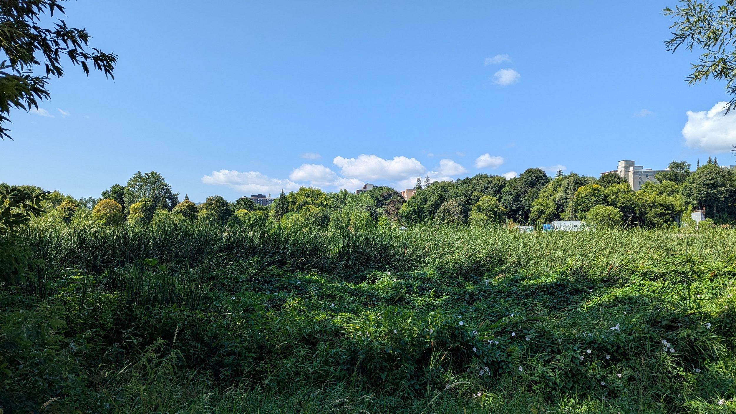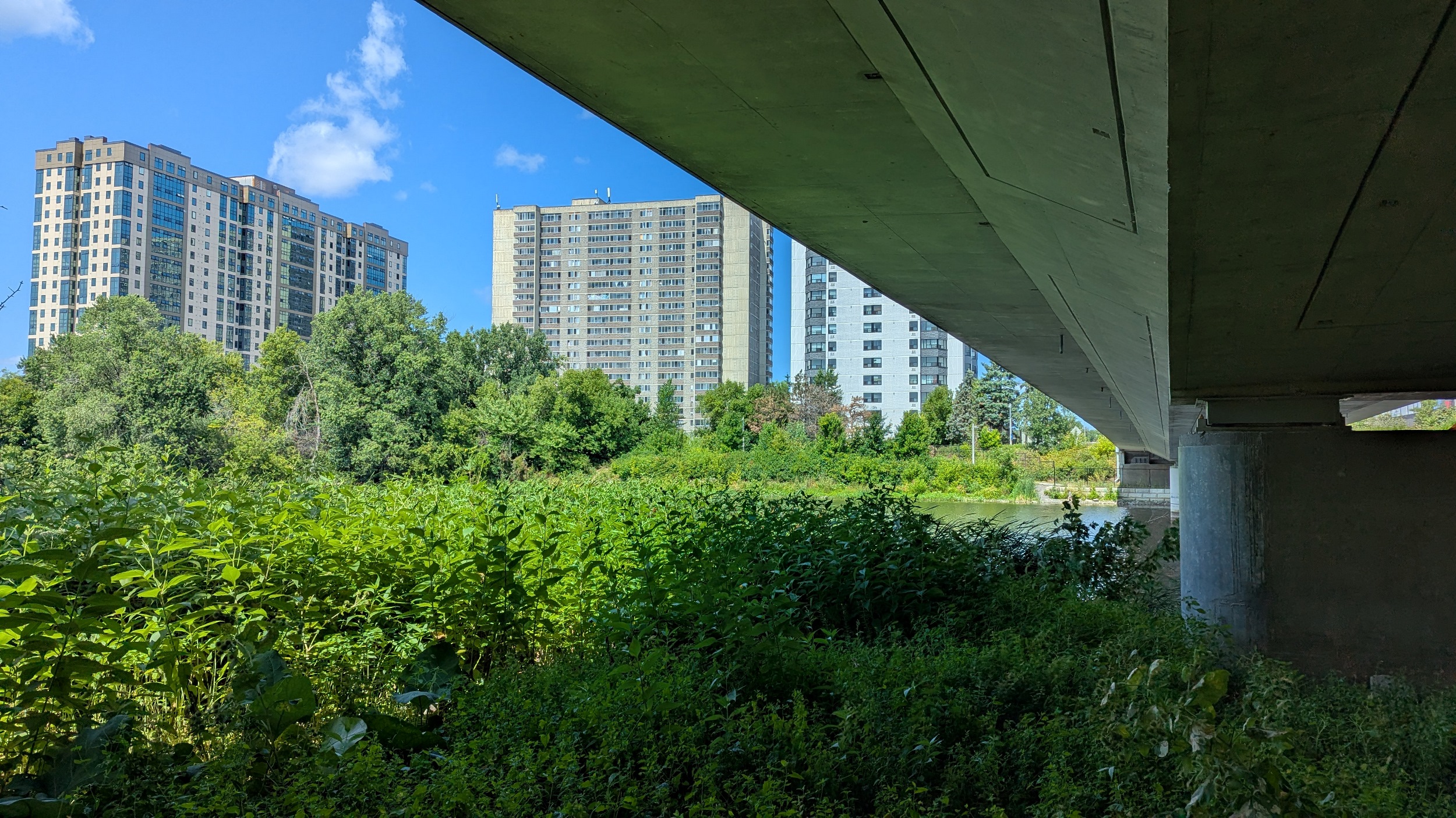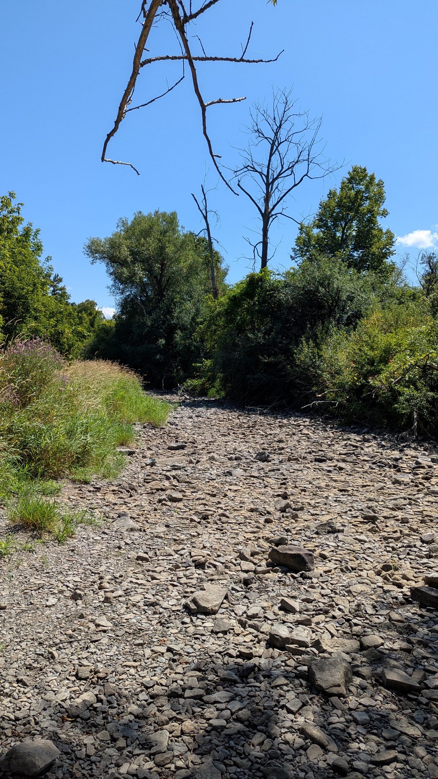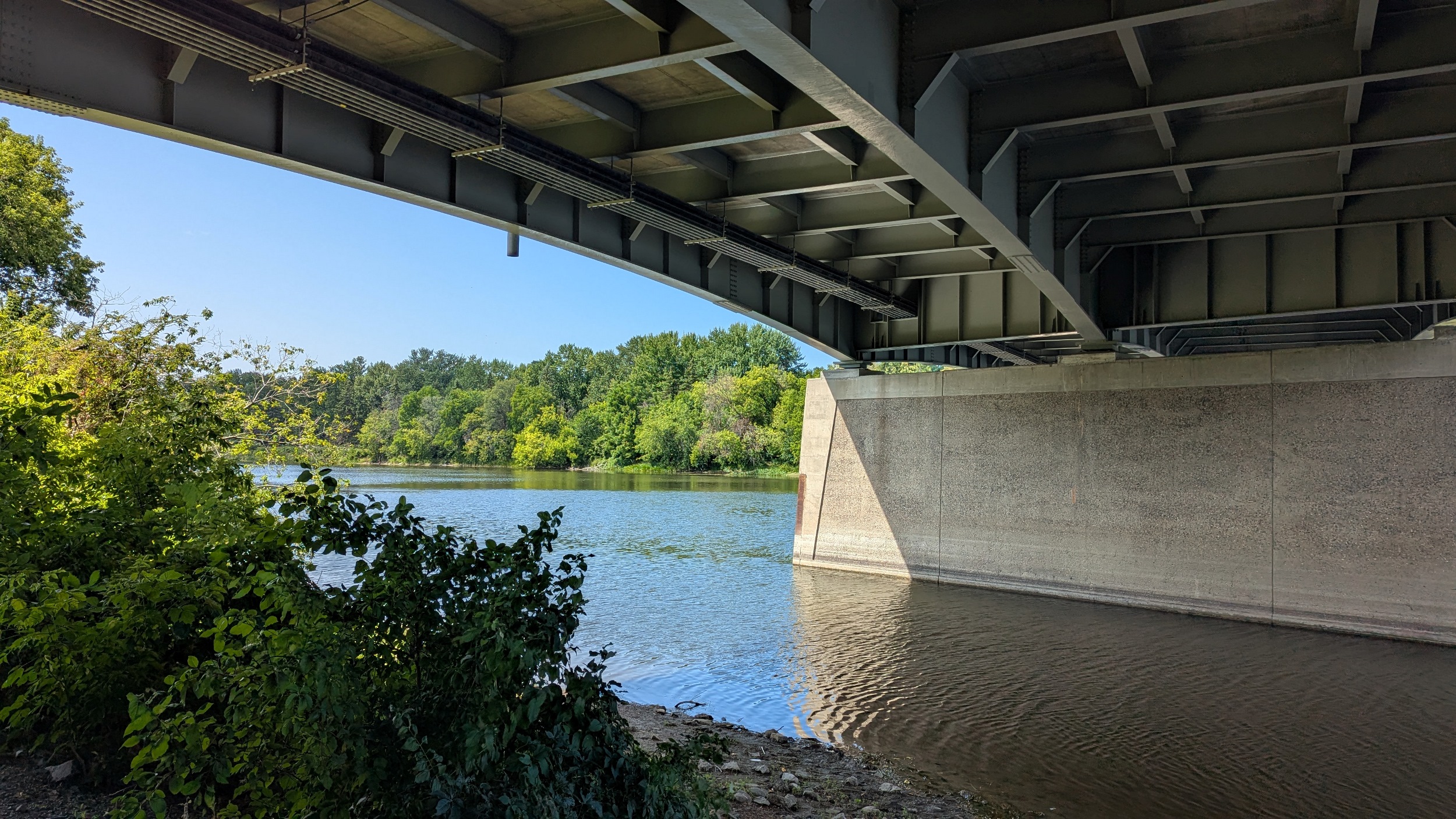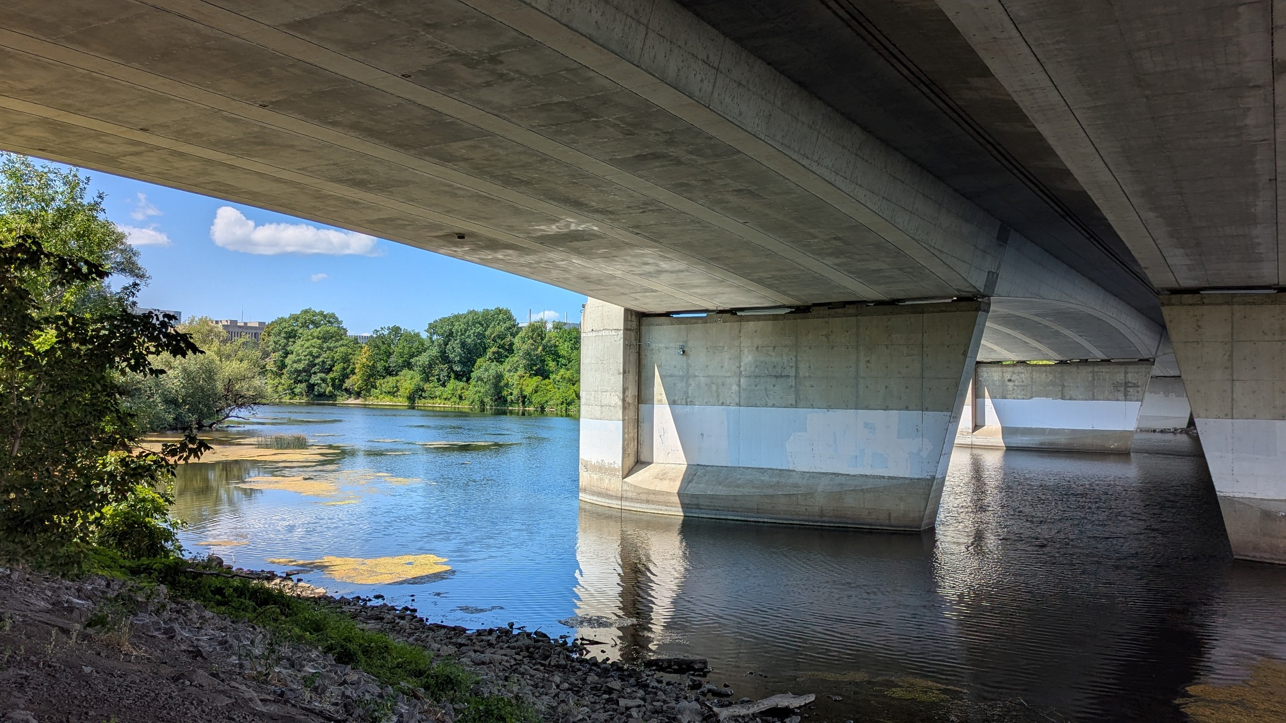 Long, hot and open stretch of the trail now, from southwest of Hurdman Station to the Billings Bridge. The shoreline vegetation occludes views of the river, and does not provide shade, but underpasses make for a reprieve. Lots of cobbles littered about, but this is more of a marshy river reach.