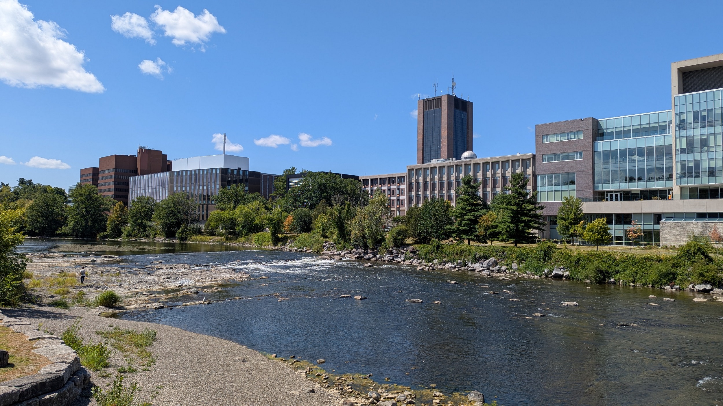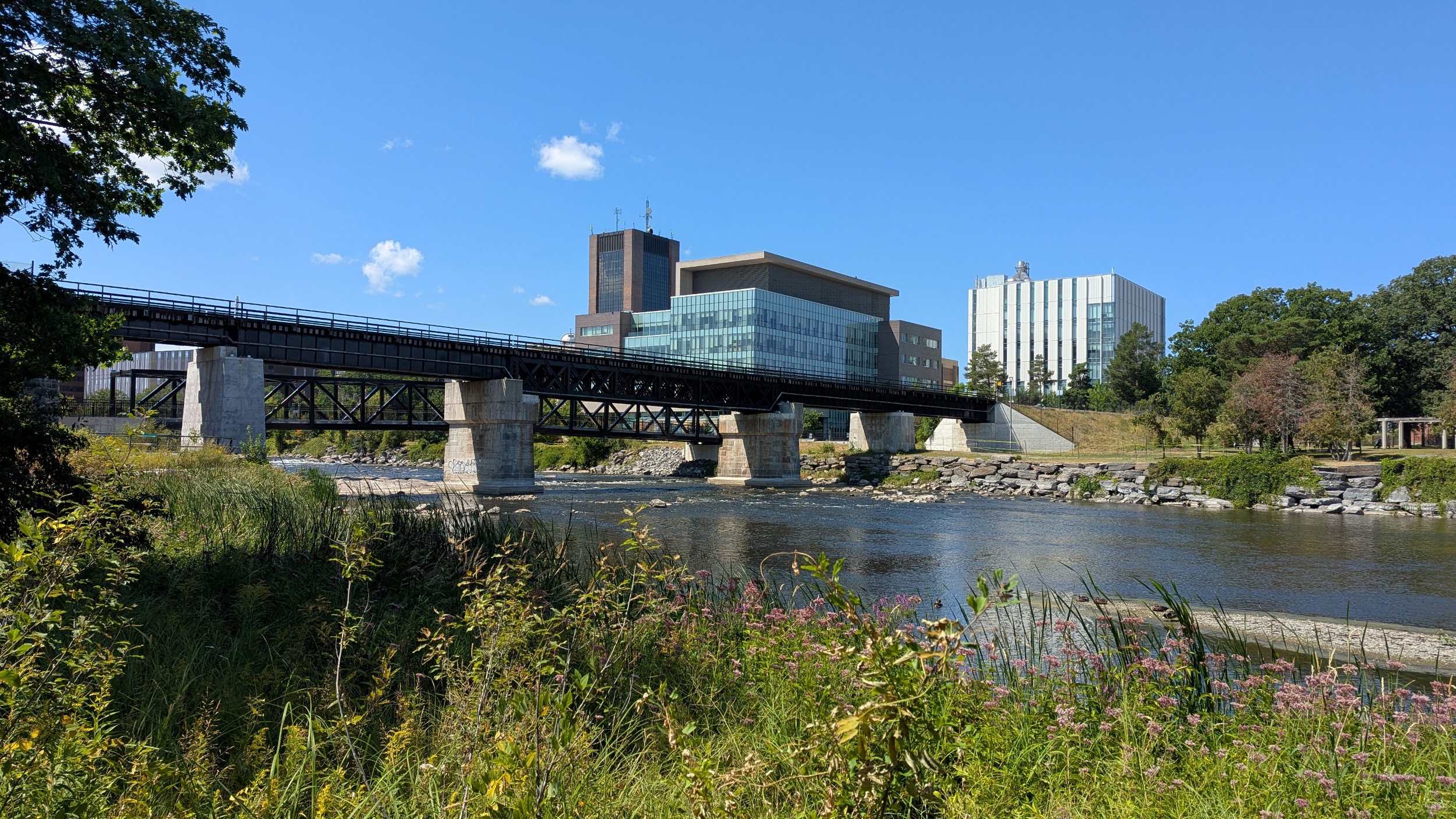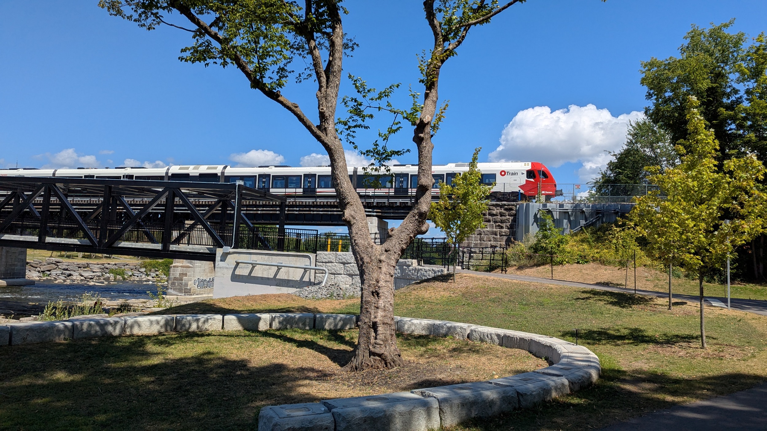 The river begins to meander and braid a bit at a couple of islands. Then the bedrock appears again as you arrive at the Trillium Line, which has a parallel trail bridge with it leading into Carleton University campus. To the south is great park space for studying and relaxing.