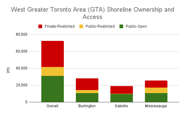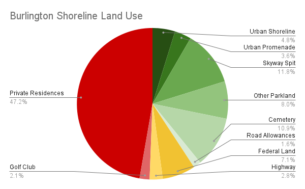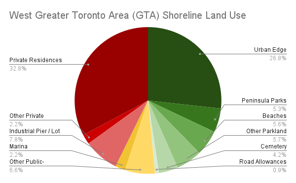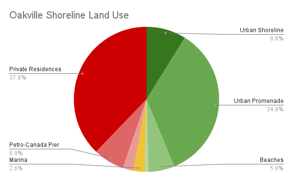 The rest of the West GTA shoreline is privately owned and inaccessible. One-third of the shoreline is taken up by private residences. Another 8% can be split between Petro-Canada’s complexes / piers in Oakville and Mississauga, as well as a Mississauga aggregate plant. The remaining 2% consists of a telecommunication tower field, Appleby College, and the Burlington Golf and Country Club.