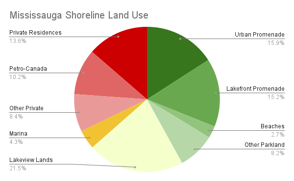 About 14% of the West GTA shoreline is publicly-owned, but restricted from public access. Over half of this is tied up in Mississauga’s Lakeview Lands, where new parkland is being built south of a wastewater treatment plant, and the adjoining inlet to a coal generating station will be redeveloped into public space for adjacent residential development. Another 2% is blocked off by public marinas, and the remainder 4% is split between part of the Burlington Skyway and the Canadian Centre for Inland Waters.